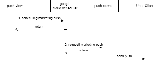 1. 마케터가 push view에 시간 등을 입력하면 push view는 google cloud schduler는 푸시 서버에 마케팅 푸시를 보낼것을 예약한다.
