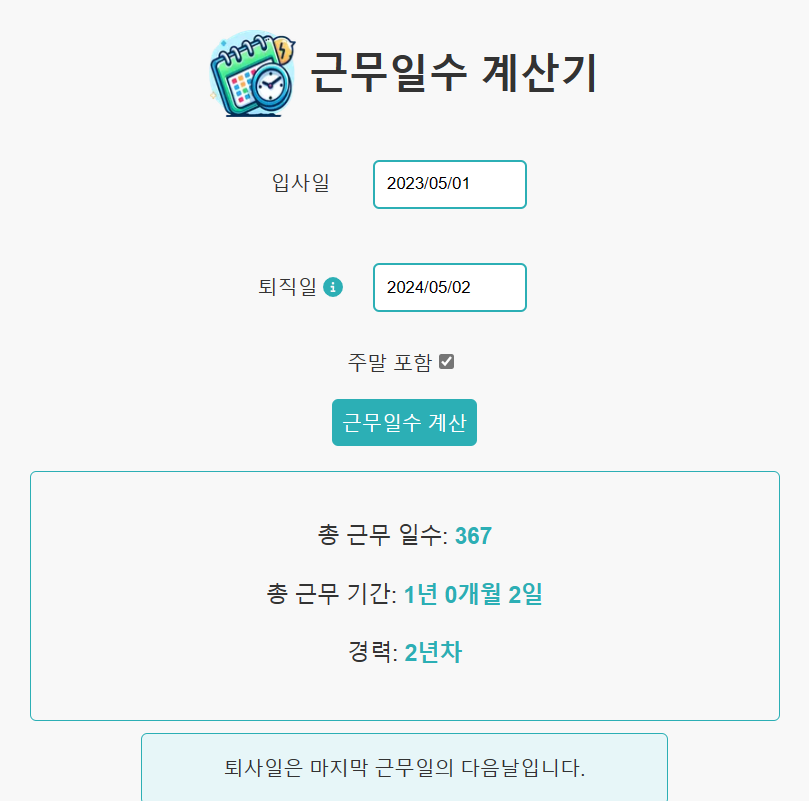 | 공휴일 정보 업데이트 | 공휴일이 변경될 수 있으니, 계산 전 최신 정보 확인 | 모든 근무일수 계산 |