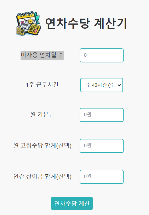 아래 표는 연차수당 계산기의 주요 입력 항목과 설명을 정리한 것입니다: