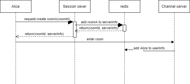5. Alice가 channel server에 입장하면, userinfo에 roomA-Alice를 추가한다.(in redis)