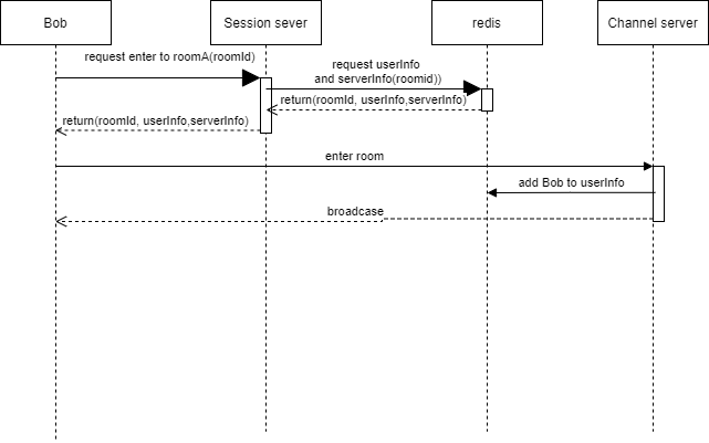 2. session server는 roominfo와 serverinfo를 조회해, room에 누가 있는지 그리고 어떤서버에 접속해 있는지를 Bob에게 return 한다.